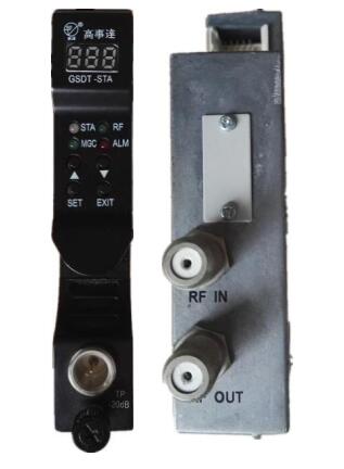 GSDT-AMP为头端或分前端正向射频放大模块,运用射频放大电路可提供高线性、低噪声和低失真的特性。通过前面板控制,可以调节输出射频信号,从而得到信号的输出电平值。由于缆线的信号损耗,造成高低频信号不平,可以通过前面板控制输出斜率,调平信号。