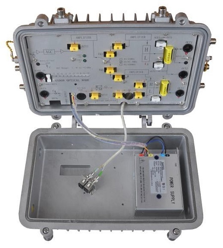 GSDON 型光站,二路射频放大,双向配置,SC/APC, 公制 F 头,60VAC 供电,FP 激光器,1310nm 波长, 0dBm 输出功率